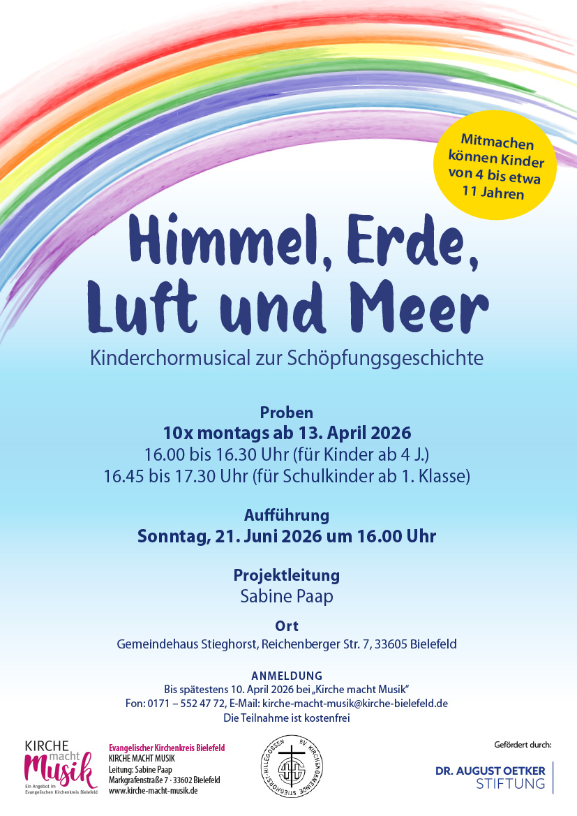 Bei der Abschlussaufführung am Sonntag, 21. Juni 2026 um 16.00 Uhr in der Stieghorster Kirche, singen und spielen dann alle Kinder gemeinsam.